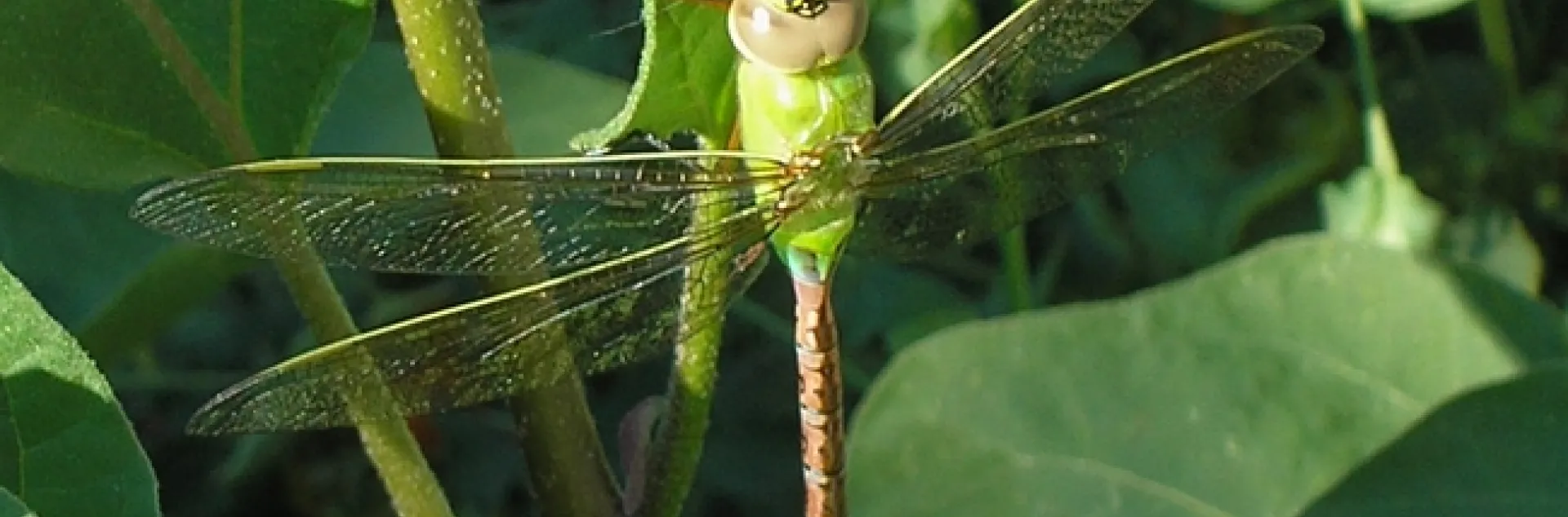 The nimble, swift, and acrobatic flight of dragonflies, combined with their exceptional eyesight, ensures successful hunting. They have almost 360-degree vision due to their two huge compound eyes, which comprise nearly the entire bulk of the dragonfly head; each compound eye contains about 28,000 single eyes. Dragonflies are voracious insectivores, with an astonishing 95% success rate when capturing prey. They can consume about one fifth of their body weight in prey each day. They'll eat just about any insect, from tiny gnats and midges up to and including damselflies and smaller dragonflies. In fact, if they can't fly, they will die of starvation, because they scoop up prey with their forelimbs while in flight. Because they only eat flying insects, aphids (for example) are safe from their predation, but mosquitos are fair game: one dragonfly can eat from 30 to literally hundreds of mosquitoes daily.