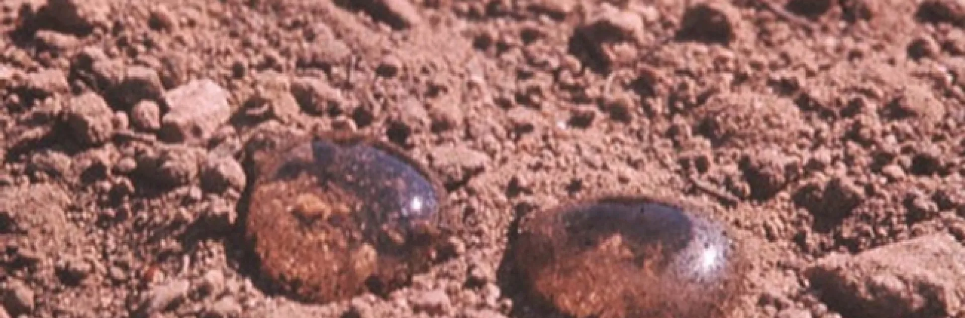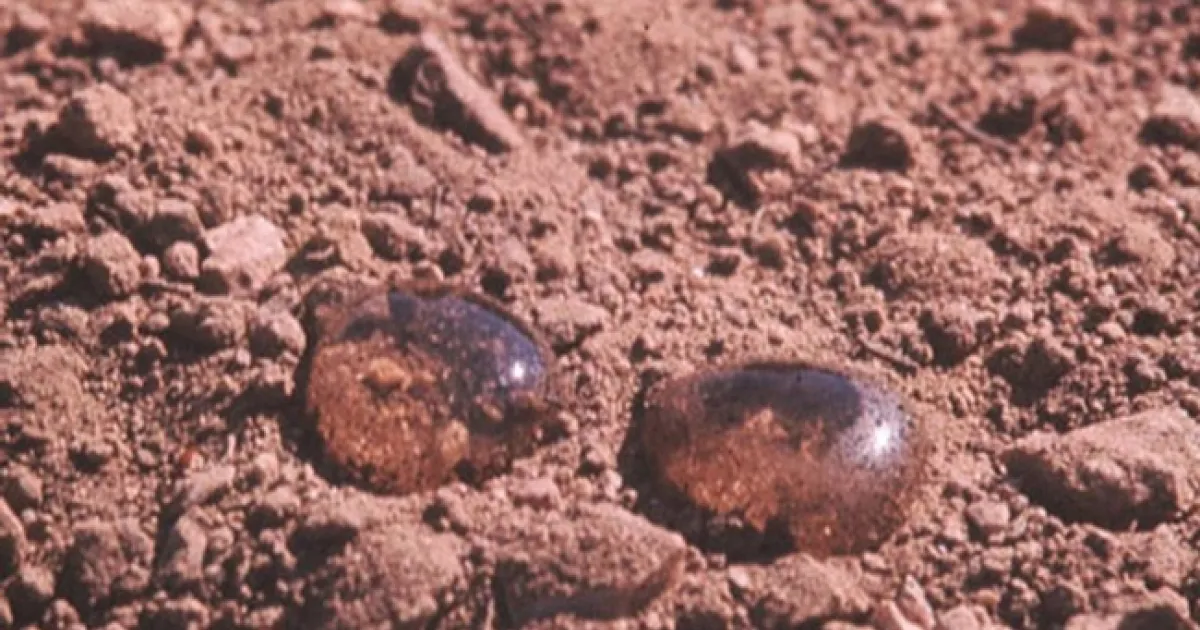 Appearance of water droplets "balled up" on water repellent soil (USFS, Wildland Fire in Ecosystems, Photo by DeBano, 1981)
