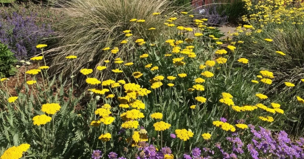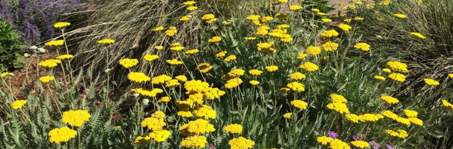 Perennials: Achillea (yarrow); Anigozanthos (Kangaroo Paw); Caryopteris (Bluebeard); Epilobium (California fuchsia); Hemerocallis (day lily); Iris (see below); Origanum (oregano); Nepeta (cat mint); Perovskia (Russian sage); Salvias; Solidago (golden rod); Teucrium (Germander); Westringia (Coast rosemary); grasses such as Bouteloua, Carex, Muhlenbergia, and Stipa.