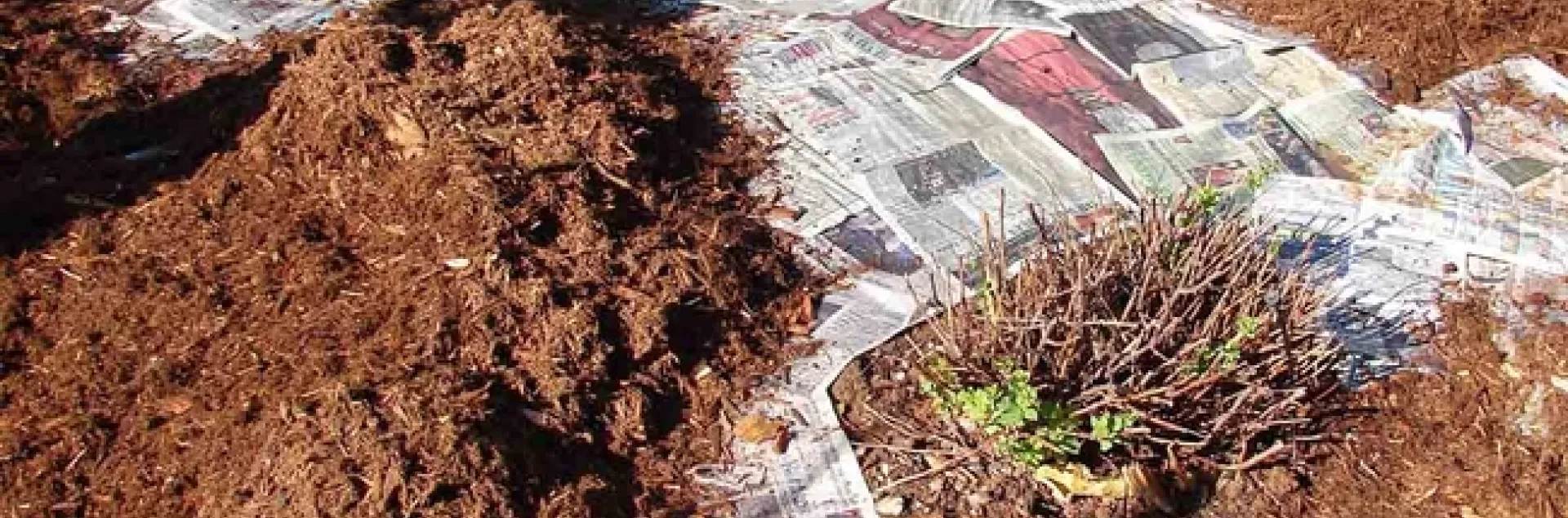 Sheet mulching kills weeds by starving them of light. It takes 6 to 10 months and can be started any time of the year as long as at least three months of growing season are included. Sheet mulching works in sun or shade, and is effective on all grasses, including Bermuda grass, and many annual and perennial weeds. It is left in place permanently; over time, the dead lawn, sheeting, and mulch will break down into soil-enriching compost. Sheet mulching should be placed before new plants are installed if being used alone to kill lawn or weeds. It can be placed after plants are installed if solarizing has been completed first. New hardscape and irrigation should be installed before commencing solarizing or sheet mulching.