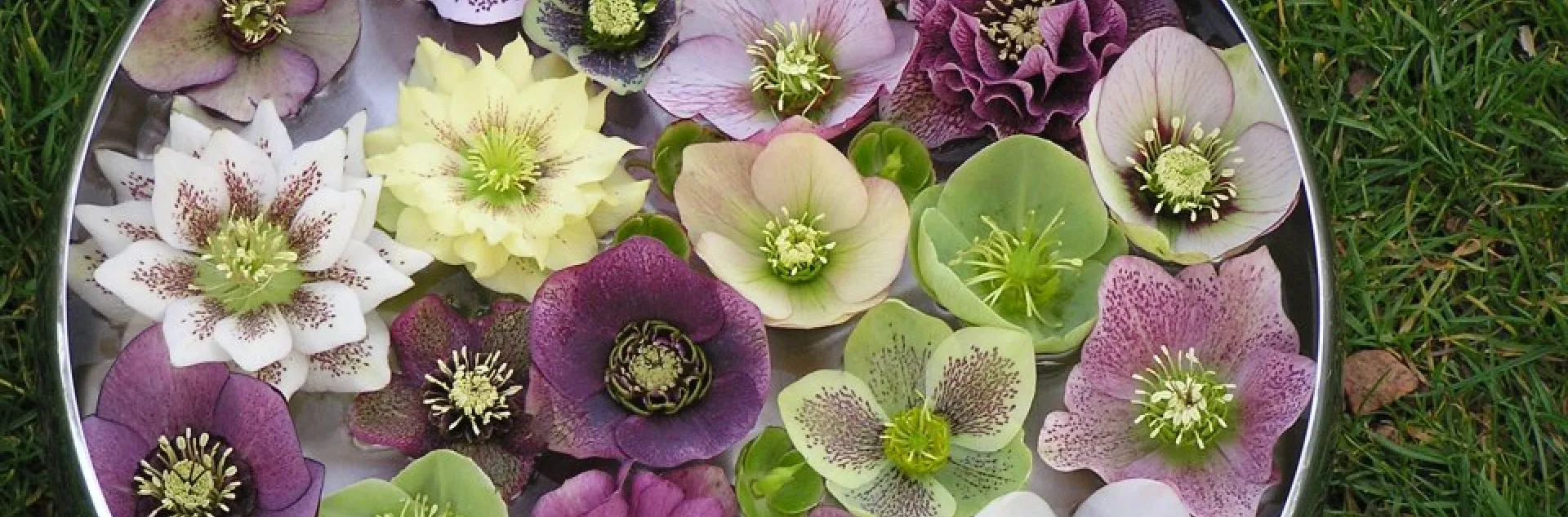 Hellebore colors range from white to purple, with many color patterns on the petals (which are actually bracts or calyxes). White flowers tend to turn green with age, while the purples hold their colors. Flowers may persist for 3 months.