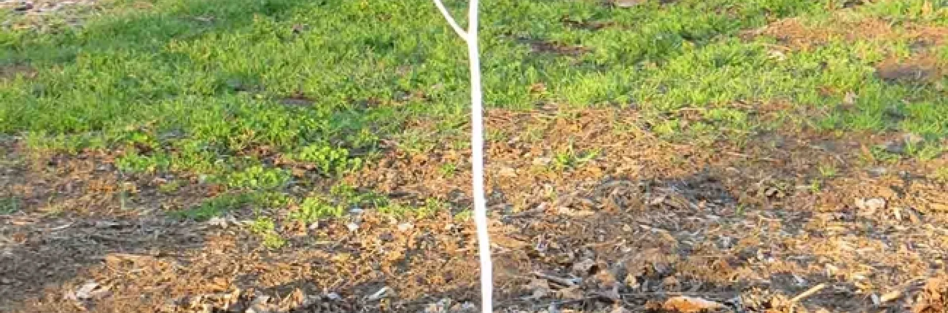Clear an area about 3 feet wide around the tree, eliminating weeds and grasses to keep them from competing with the tree for water and nutrients. To prevent future weed growth and conserve moisture, a layer of mulch 3 to 6 inches thick can be placed around the tree. However, to avoid crown rot, keep the mulch several inches away from the tree trunk. As a final step, remove the top of the tree by pruning back to a single trunk approximately 24 inches tall and paint the bark of the entire tree trunk with white interior latex paint diluted with water (two parts water to one part paint) as a whitewash to reflect excess heat. This prevents sunburn and the resulting invasion of wood-boring insects that can stunt or kill the new tree.