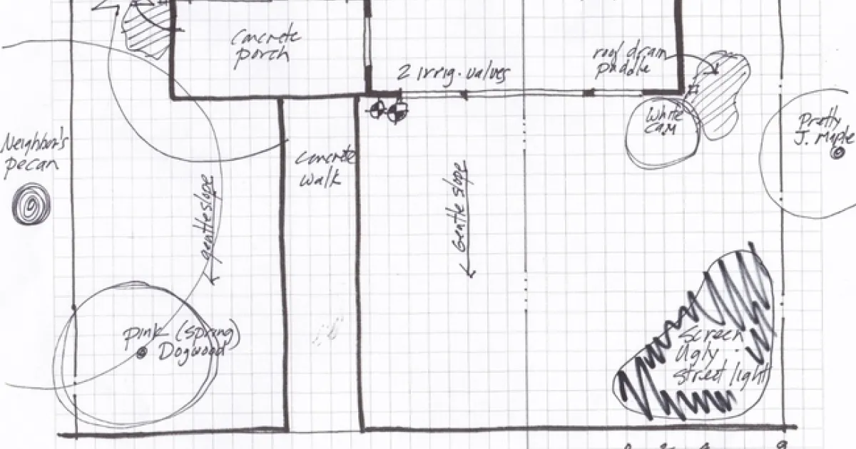 Begin by drawing a base map, to scale, of the site. Include the house footprint, the location of doors and windows, existing plants that you want to keep, hard scape areas such as paving and fencing, and utilities. Note the architectural style of your home. Make several copies of your base map.