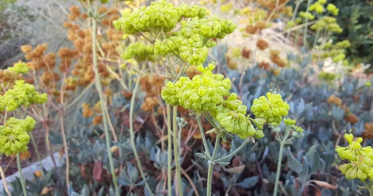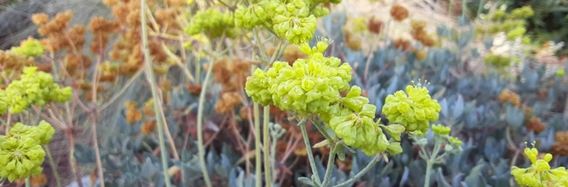 A mere three subspecies belong to E. grande (Island or Redflower buckwheat), and all are native to California's Channel Islands. E. grande var. grande is found on several of the Channel Islands, and the very rare E. grande var. timorum is native to the southern Channel Island of St. Nicolas. The only one that is available horticulturally (according to Calscape) is the variety planted at the Master Gardener Demonstration Garden: E. grande var. rubescens. This buckwheat is commonly called red-flowered buckwheat or simply red buckwheat and is extensively planted in native gardens state-wide due to its beauty, compact form, and blooms that last up to seven months.