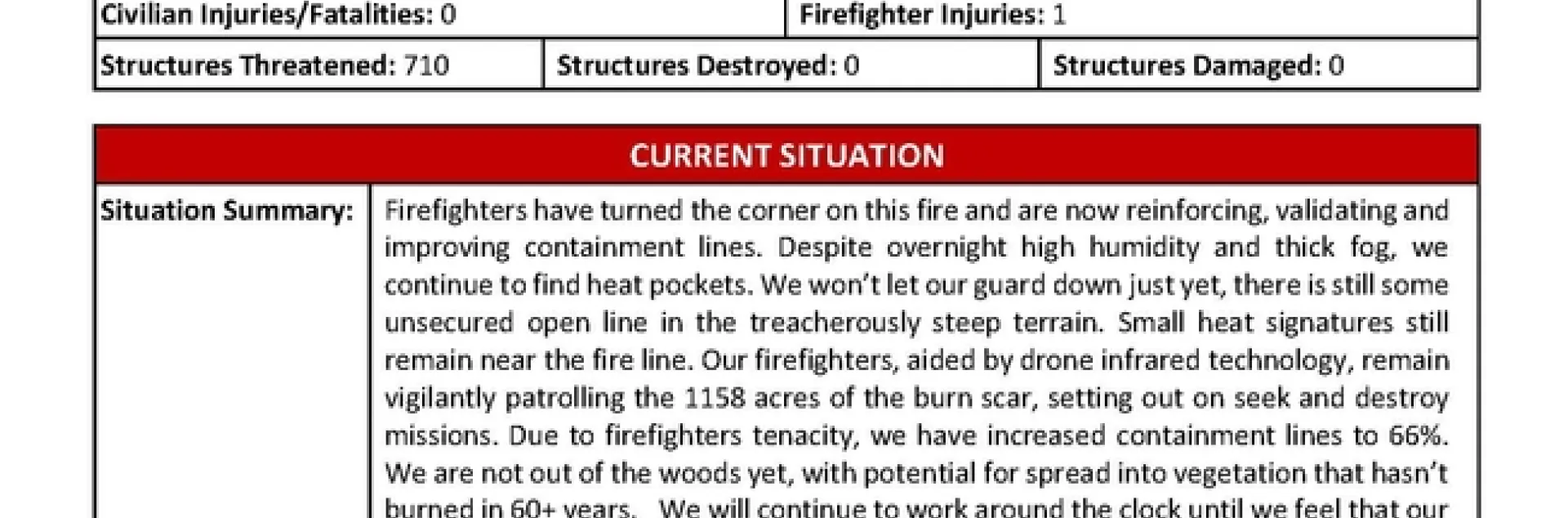 The Los Angeles Fire Department has updated containment of the Palisades Fire to 72%, and just under 1200 acres. In addition, an suspect has been detained and charged with felony arson by the LA County DA's office. If you'd like to learn more about, or support, Malibu/Topanga's volunteer arson watch, visit http://www.arsonwatch.com/. ANR's resources on fire recovery can be found here.
