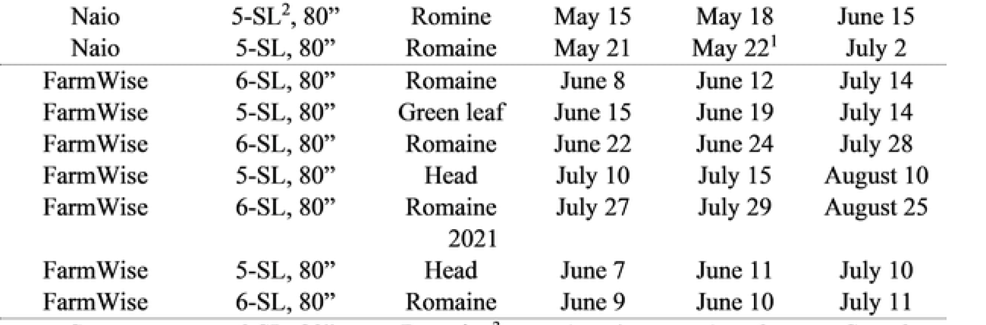 Methods: Twelve trials were conducted in 2020 and 2021. Table 1 shows the details about each trial: machine used, planting configuration, lettuce types and dates of operations. The FarmWise and Stout autoweeders used a split-knife kill mechanism and the Naio machine used finger weeders. Autoweeding was carried out after thinning (except Dino Trial No. 2 was cultivated prior to thinning) and were compared with standard cultivation which leaves a 4-5 inch wide band around the seedline. In 2020, pre and post cultivation weed and stand counts were made of a 6-inch wide band around the seedline to determine the efficacy of standard and auto cultivation, but in 2021, pre and post cultivation weed counts were made following the passing of the standard cultivation. Weeding time measurements were made of the time it took a commercial hand weeding crew to pass through the treatment rows which was then converted to hours per acre. Stand counts and harvest evaluations were conducted to determine if the auto weeders caused damage to the stand or to crop plants.