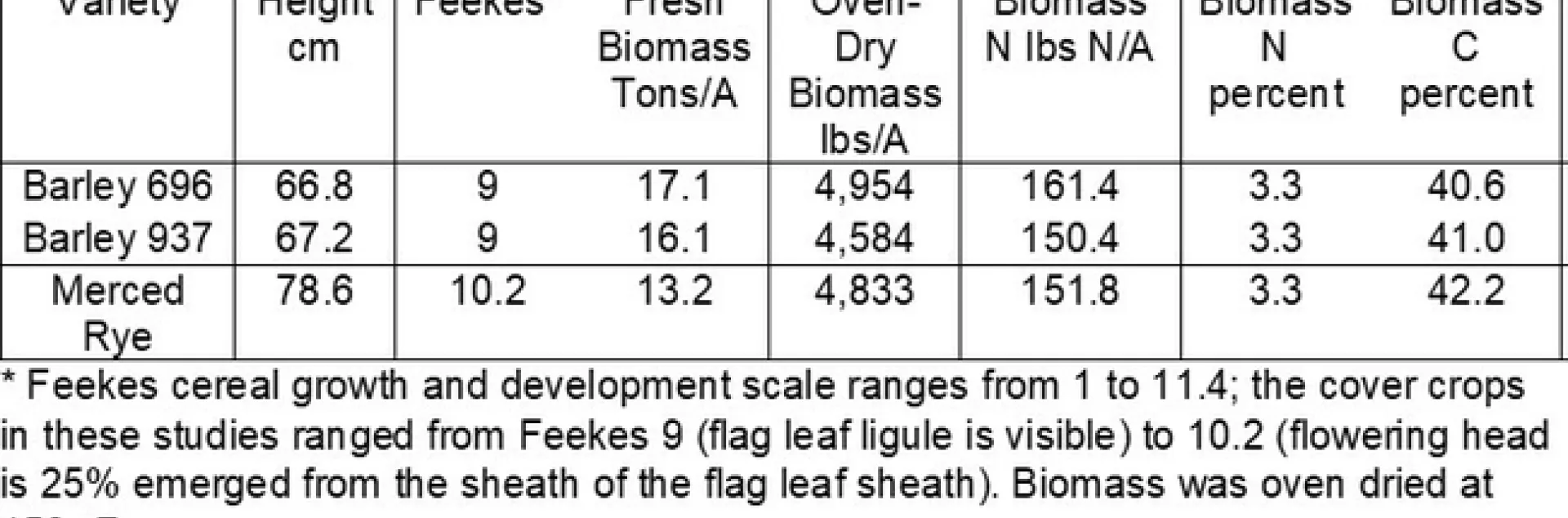 In the fall of 2021, we conducted six on-farm evaluations of fall-grown cover crops to determine their productivity, nitrogen scavenging capability and C:N ratio at incorporation. Planting dates ranged from August 25 to October 3, and the average days to incorporation was 54 (ranged from 47 to 59). Two barley varieties UC 696 and UC 937, as well as Merced rye were planted in each evaluation. The barley varieties were included because we anticipated that they would reach the heading growth stage more quickly than rye when growers typically terminate cover crops. However, in these evaluations, barley did not reach this stage any faster than Merced rye as measured by the Feekes cereal growth and development scale (Table 1). In 54 days, all cover crops produced more than 4,500 lbs oven-dry biomass and took up from 150 to 161 lbs N/A. The C:N ratios of the cover crops ranged from 13.0 to 13.4.