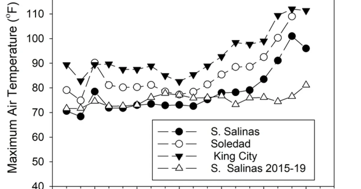 Once again, we are experiencing a prolonged heat wave in the Salinas Valley. Maximum air temperature in the King City area reached 112 °F earlier in the week (Fig. 1). Recent maximum air temperatures in South Salinas have been far greater than the average temperatures recorded for the same period during previous years (2015 through 2019).