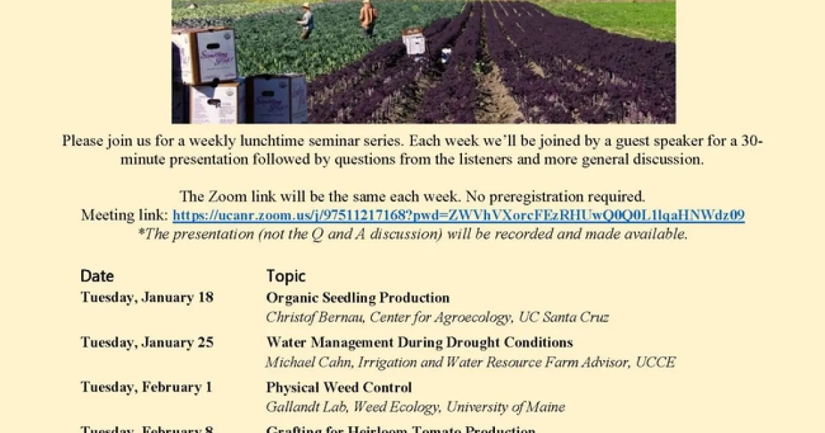 January 20, 2022By Kelley L Sivertson Print The Zoom link will be the same each week. No preregistration required.Meeting link: https://ucanr.zoom.us/j/97511217168?pwd=ZWVhVXorcFEzRHUwQ0Q0L1lqaHNWdz09*The presentation (not the Q and A discussion) will be recorded and made available.