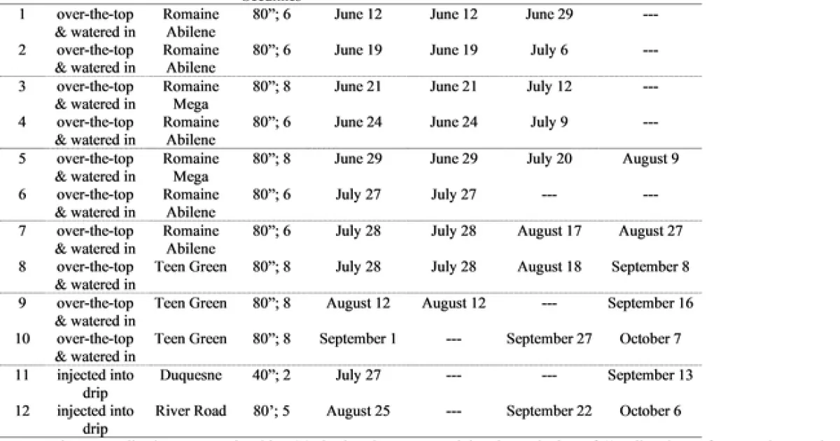 In summary, there was a modest level of control of Pythium wilt with the applied fungicides and biologicals. Injection into the drip system appeared more effective than over-the-top applications. It appears that evaluating a more effective means of applying fungicides and biologicals may be useful to see if better control may be achievable, especially in fields with history of high incidence of the diseases and during the fall lettuce crops when warm temperatures are expected. However, the challenge remains getting the material to move throughout the volume of soil occupied by the root system. This is important because infections with Pythium wilt can start on finer lateral roots or deeper in the soil and come up the tap root. Getting effective concentrations of a fungicide or biological material to the whole root system becomes a great challenge. Similarly, determining the right time of application requires further investigation.