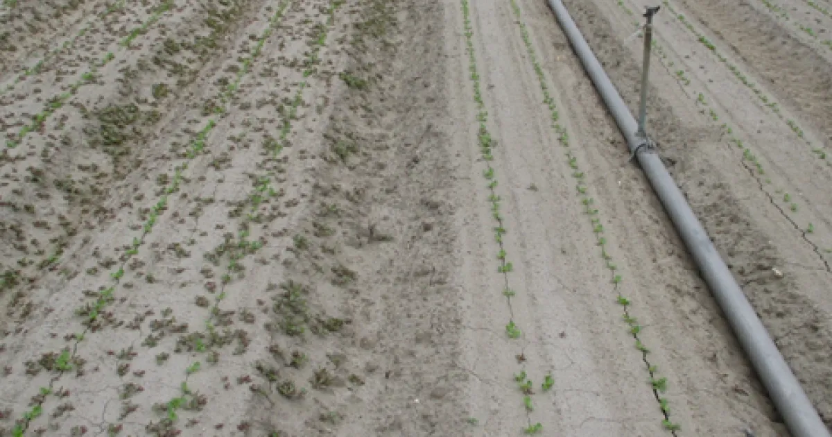 Many growers now are now using drip irrigation to germinate lettuce. Grower may apply the same amount of water with drip germination as with sprinklers, but the movement of the water is different which affects a surface applied material differently. With this method of germination, there are a couple of interesting dynamics that occur: 1) Kerb is not pushed too deep by this germination method and effectively reduces weed populations whether injected into the germ water (currently not a registered method of application) or sprayed on the soil surface and activated by the drip germination water (Table 1); and 2) fewer weeds emerge with drip germination than with sprinklers, regardless of the herbicide program.