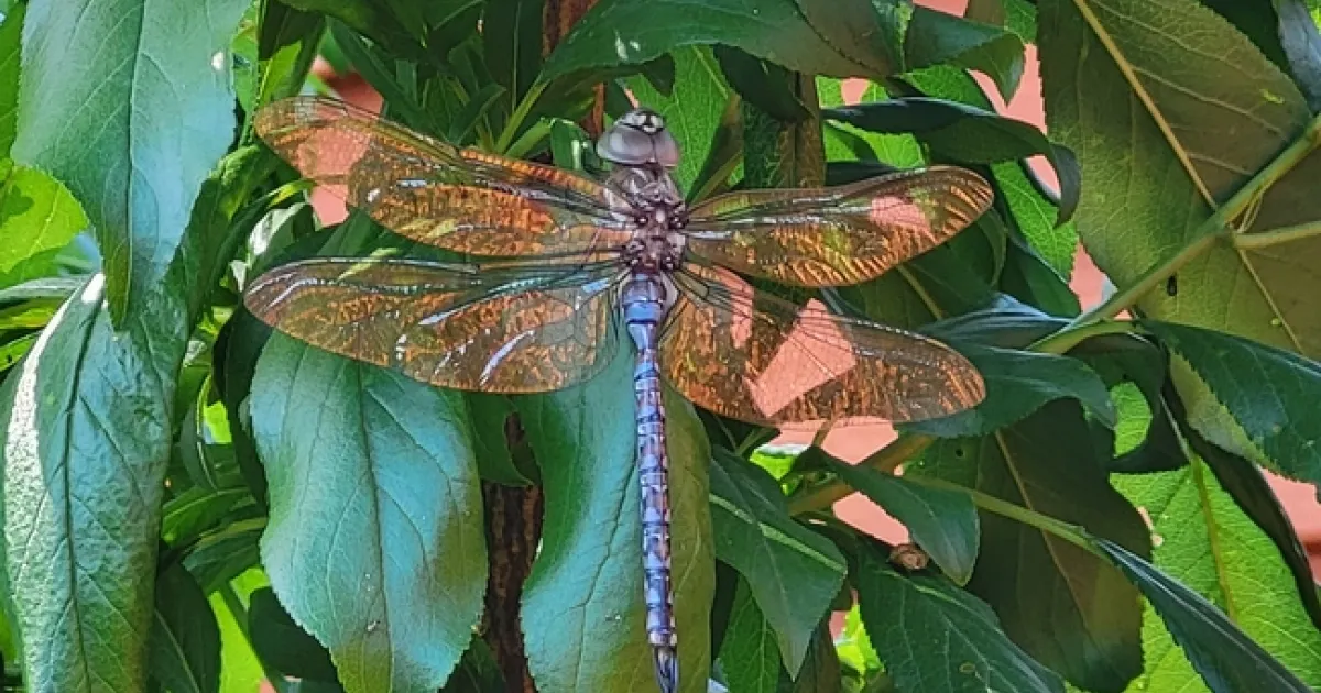 I quickly (well maybe not so quickly, it took a couple years) dug up and lasagna'ed the lawn and set up some garden beds and patches of native plants. It was only a few years after that that I started to spot the dragons: a flame skimmer resting on a corn stalk, a blue-eyed darner lurking among the peach leaves. This left me somewhat confused because I did not believe that dragons would be interested in my land-locked urban lot.