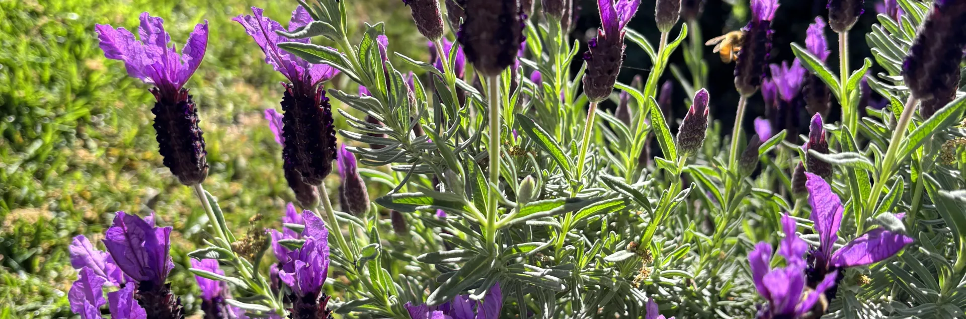 This is the unusual-looking lavender with blooms that have “bunny ear” bracts sprouting from the top of the squat flower spike. It is one of the earliest bloomers, beginning in early spring and continuing into summer. It may have a second flush of blooms if the plant is lightly trimmed after the first bloom cycle. It is fairly compact, growing from one-and-a-half to three feet high, and it is especially heat and drought-tolerant. Spanish lavender can be found in a range of colors from white to dark purple. A particularly good variety for Zone 9b is the reddish-purple ‘Otto Quast’, a UC Davis Arboretum All-Star. Take note that Spanish lavender is not recommended for culinary uses due to its high camphor content which gives it a stronger, sharper scent and a bitter taste.