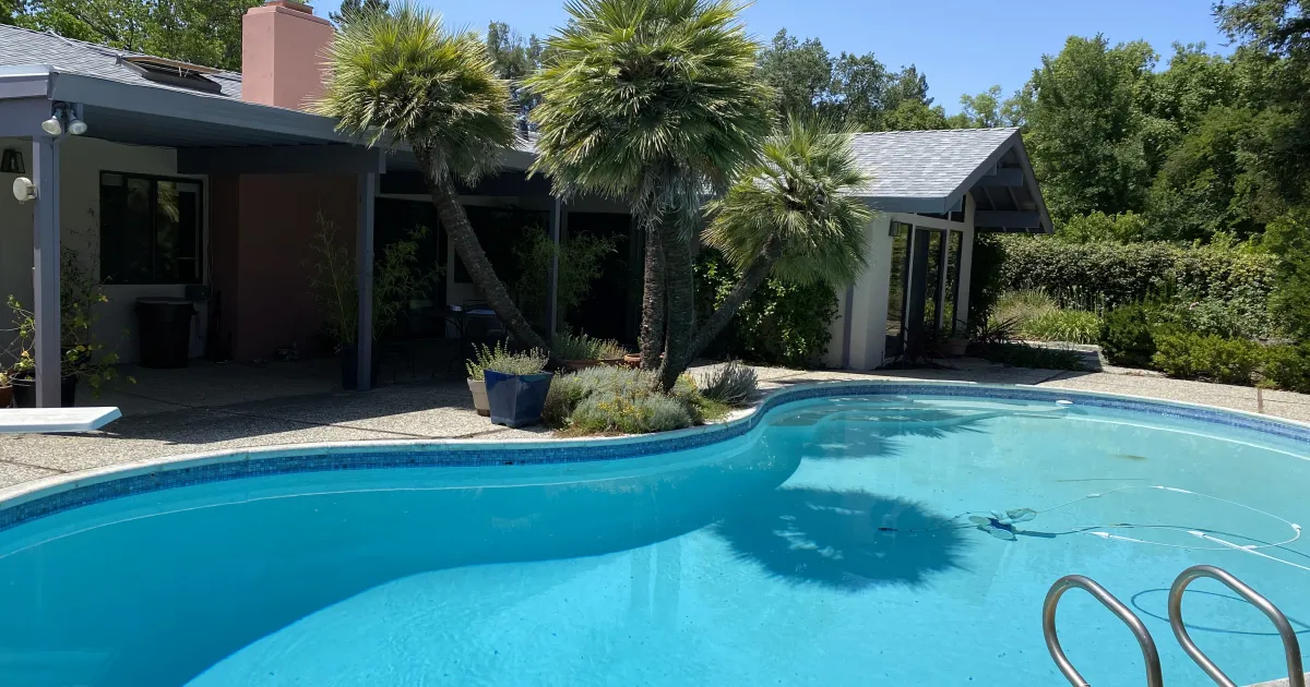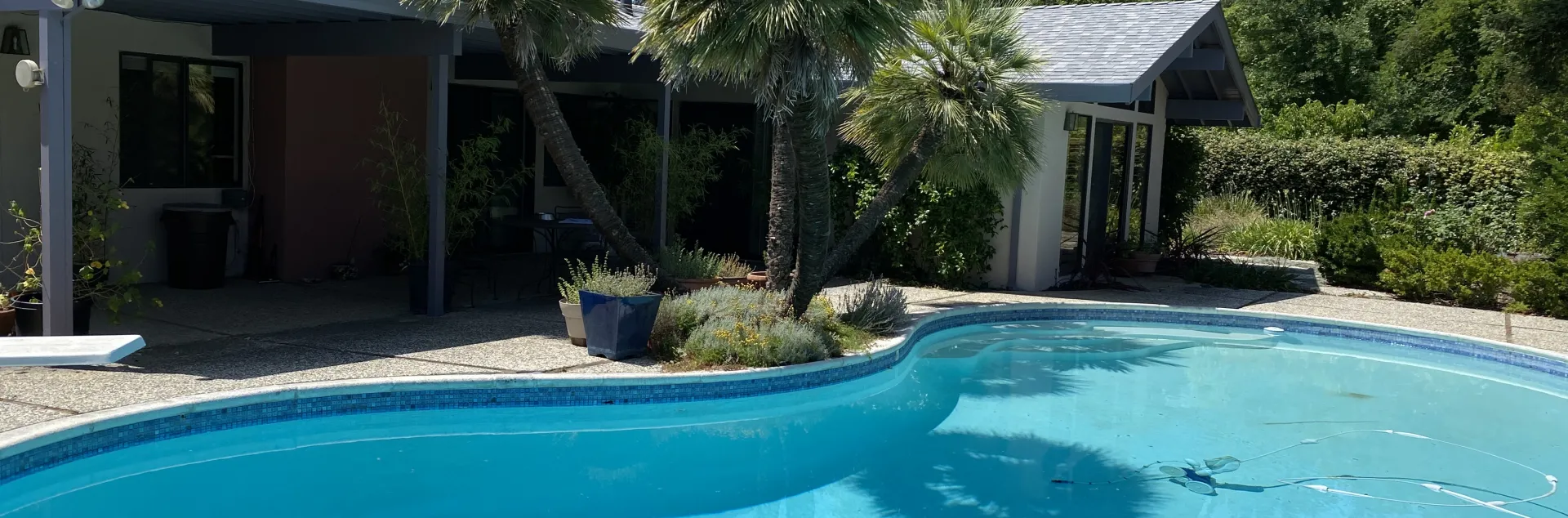 The focal area by the pool contains four Mediterranean fan palms (Chamaerops humilis) that grow in a cluster and create a vacation oasis in our own backyard. These palms do well in our region and require very little care, periodically needing some dead fronds (leaves) removed. They seem to be doing well with sufficient moisture through annual rainfall and very little supplemental irrigation. This palm, as with most palms, needs a fertilizer intended for palms, rather than a general fertilizer. Palms need magnesium and potassium in amounts that are greater than what is found in a regular fertilizer. They also may need one or more micronutrients, and fertilizers formulated for palms will contain these. The Mediterranean fan palms really add to the attractiveness of the pool area in the backyard providing interest, shade, and greenery in a paved patio.