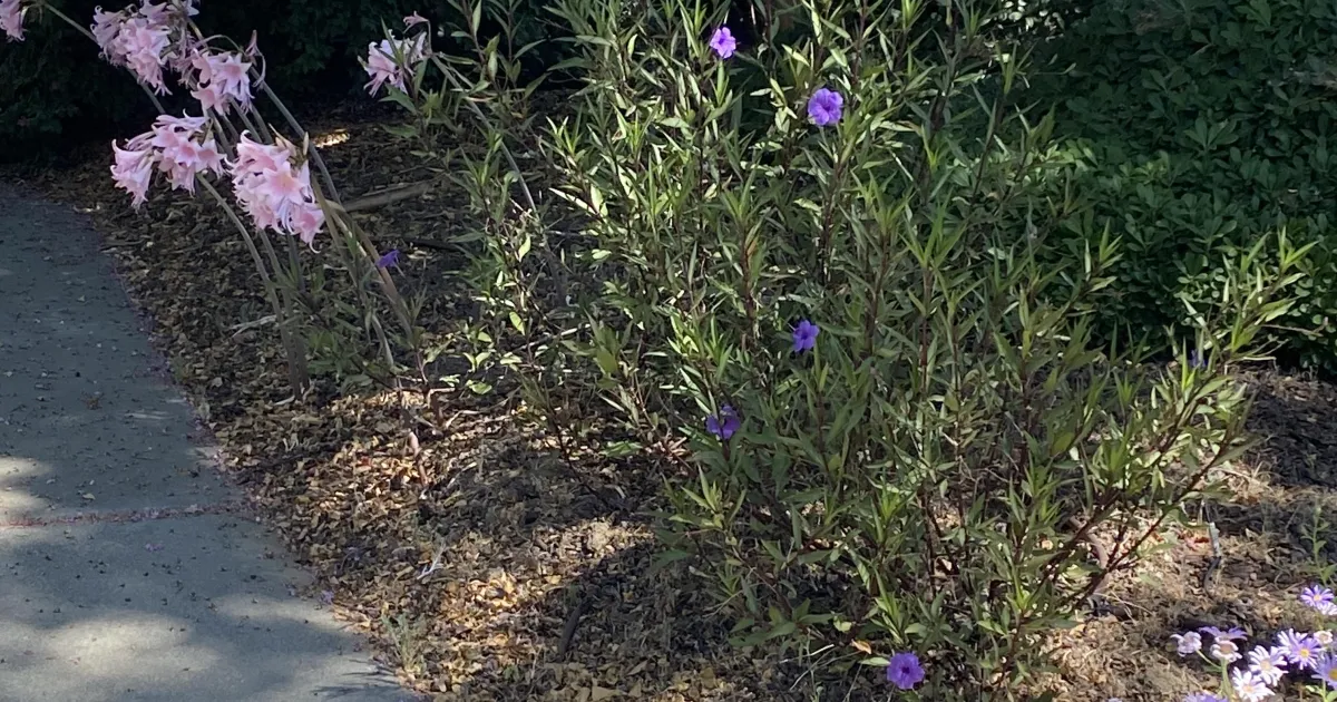 Another sun-loving and heat-tolerant plant that we discovered is the blue Mexican petunia (Ruellia brittoniana). It has a somewhat lacy appearance, with visible stems and smaller leaves. Each day, an entirely new crop of deep purple flowers is produced. Bees enjoy visiting this plant, and its mature size is expected to reach about three feet tall by three feet wide.