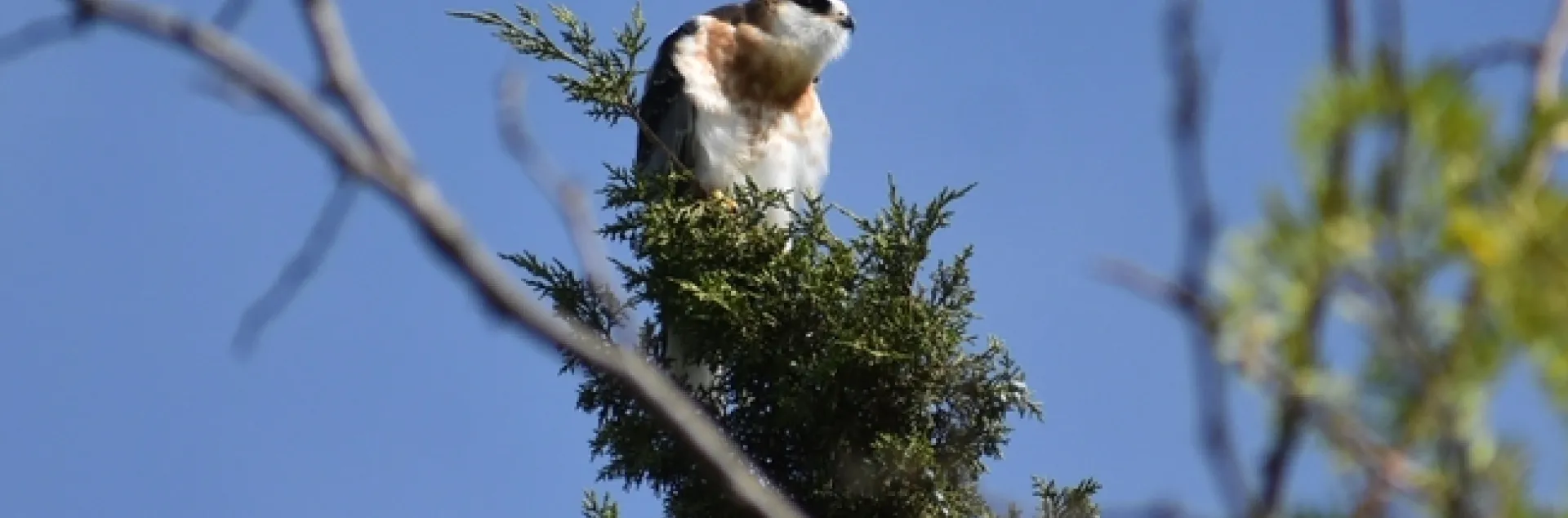 Occasionally, one gets to observe closely one of the beauties of nature, which is not so common. A couple of years ago, a pair of white-tailed kites, seemingly unperturbed by the children playing at the elementary school and the sometimes-busy traffic, chose a tree for their nest that allowed the neighborhood to watch and marvel. We saw the courting behavior where they would tangle talons together and fall through the air. We watched the steady collection of twigs as the nest grew in a position in the tree that to us seemed precarious. Nests are shallow cups about 21 inches wide in which a clutch of up to 4 eggs are laid in a cup lined with grass about 7 inches deep, 4 inches wide. Then the wait as the parents incubated the eggs for about 30 days with sorties for food. Eventually, we could see two fledglings with voracious appetites. Their ‘fluff' slowly transformed into adult plumage. As they tried out their wings and figured out how to use their tail feathers it looked as though any minute they would fall. Each day I would go and set up my camera as they seemed to be on the brink of flight. One morning watching I was lucky enough to capture the moment of first flight, the magic, the glory of nature and the beauty.