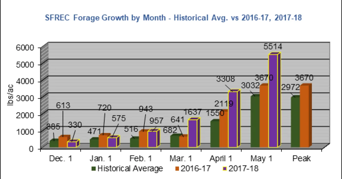 Bar chart titled "SFREC Forage Growth by Month - Historical Avg. vs 2016-17, 2017-18." The chart displays forage growth in pounds per acre for December through peak, with three color-coded bars: green for historical average, orange for 2016-17, and purple for 2017-18. The highest peaks are in May, reaching 5514 lbs/acre for 2017-18.
