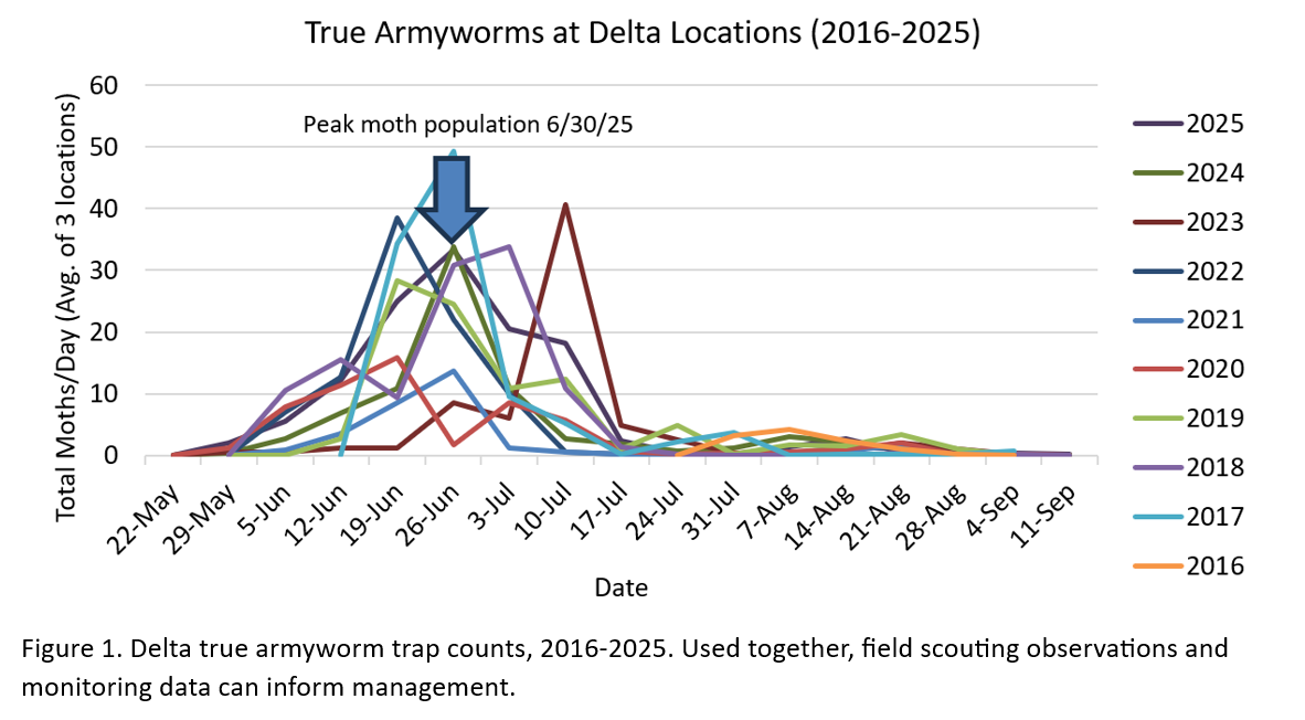 Armyworm Monitoring: In 2025, we monitored true armyworms on three Delta farms, and moth catches peaked around June 30th. Figure 1 shows the average catches across the three farms (9 traps total). The peak population number and timing were similar to what we observed in 2024, which was less severe than in years like 2017, 2018, 2022, and 2023. Trap catches varied across the three farms and across fields on the same farm, which is why it is important to scout for field-level impacts.