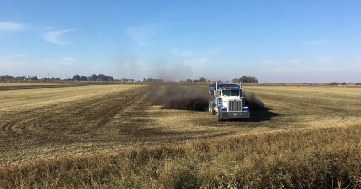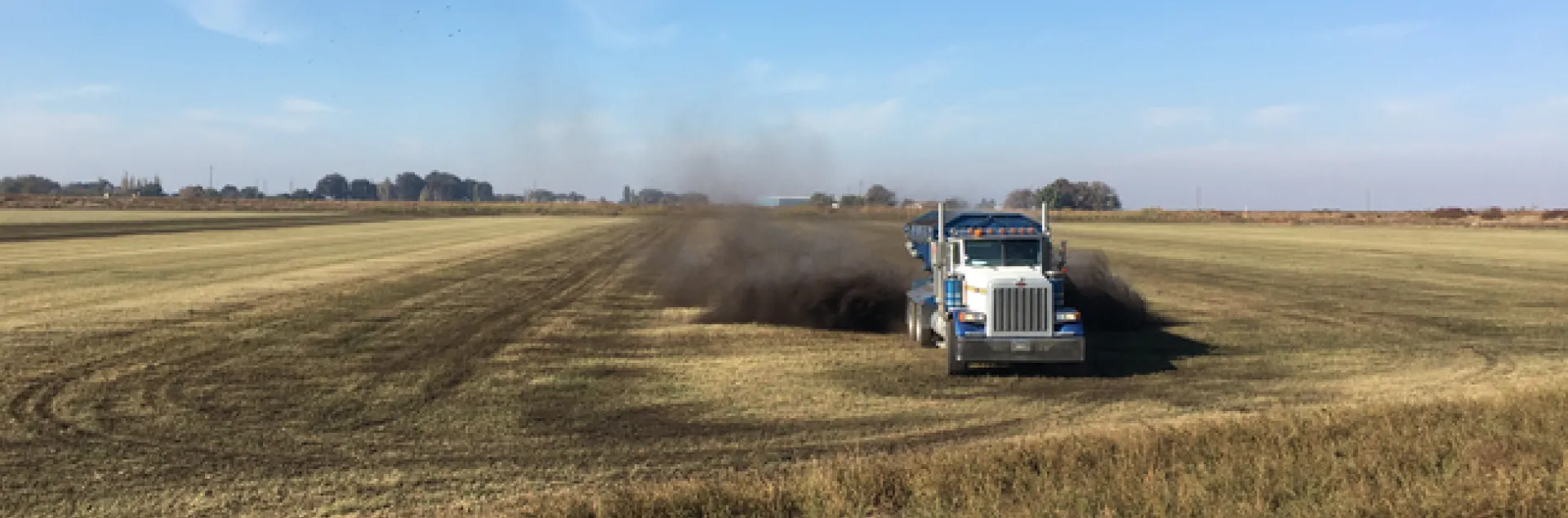 Figure 2. Compost spreading at the San Joaquin County trial. Compost is not a small expense, but it may help improve soil functioning and alfalfa yield over the long-term.