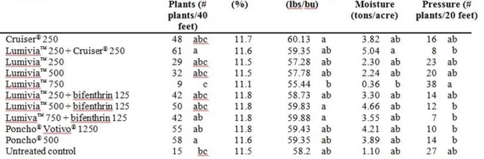Growth results are described in the online report. Yields at the Staten Island trial were highly variable, and both wireworm and weed pressure may have contributed to the variability (Table 1). Johnson grass pressure was especially high in treatments where plant stands were compromised by wireworms or birds. High weed pressure can be a consequence of poor wireworm control because stands that are compromised do not provide the consistent shading to out-compete weeds. Yields can suffer as a result. The Lumivia™ + Cruiser® treatment yielded the highest, and Lumivia™ 750 yielded the worst, even lower than the untreated control. The poor result of Lumivia™ 750 may be explained by uncontrollable factors, namely, bird damage and high wireworm pressure. The polymer treatments that were tested at the Tyler Island site showed no yield benefits over the non-polymer treatments and yielded similarly to the commercial standard, Poncho® Votivo® (Table 2).