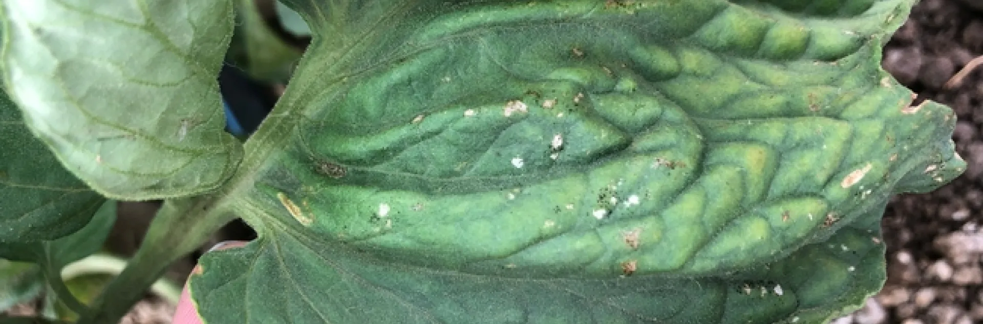 Tomato spotted wilt virus (TSWV), transmitted by western flower thrips (Frankliniella occidentalis), is widespread in Yolo/Solano/Sacramento county and can cause severe damage to fresh market tomatoes and peppers. Using a piercing-sucking mouthpart, thrips damage appears as small white/silver/grey patches (see photo). To confirm the presence of thrips, lightly shake a plant onto your hand or a dark surface and use a hand lens to look for the insect, or take a hand lens to the leaf damage and check for thrips. Young plants infected with TSWV are stunted with leaf bronzing (see photo), while mature plants have green and red fruit that are bumpy and deformed and typically show diagnostic ringspots (often concentric in green fruits). TSWV diagnosis can be made onsite using an ImmunoStrip, available from your local farm advisor.