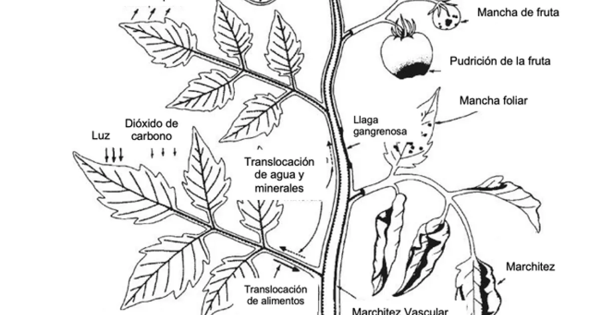 Diagrama de una planta etiquetado en español, que muestra procesos como la fotosíntesis y el transporte de nutrientes, junto con enfermedades comunes que afectan a las hojas, los tallos, los frutos y las raíces.