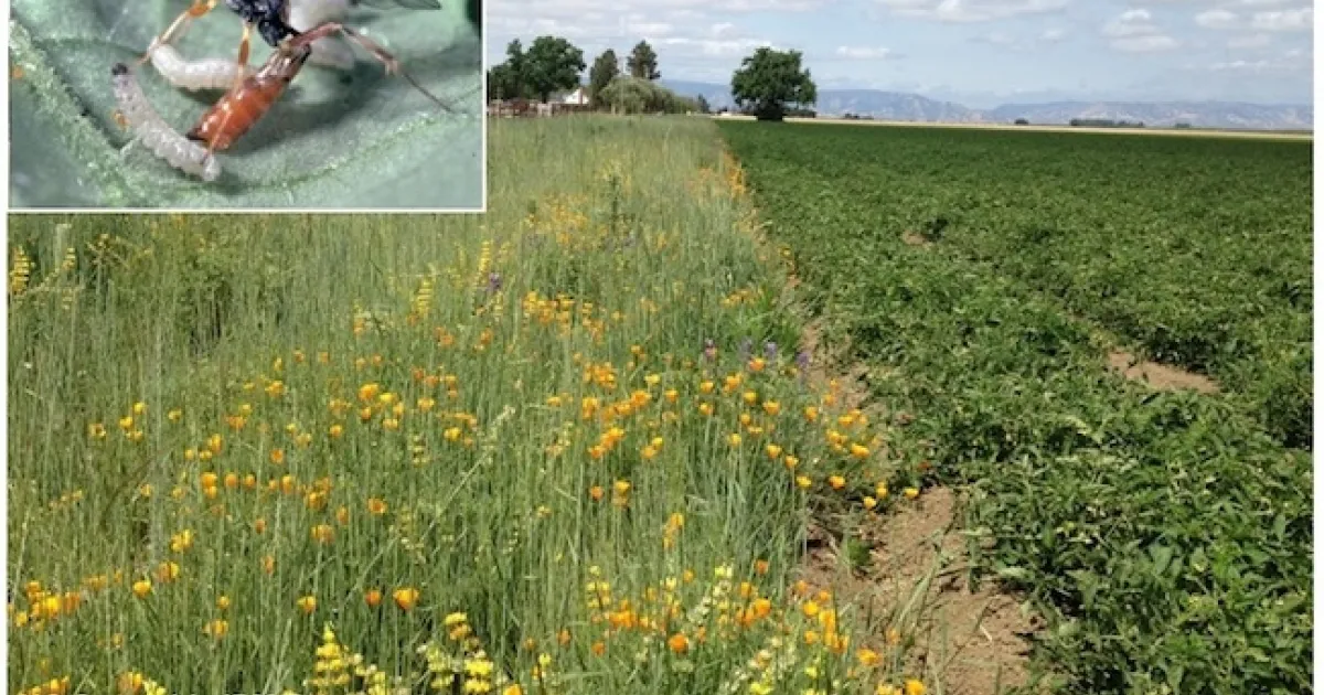 Biological control, or the use of natural enemies to reduce pests, is an important component of integrated pest management. Fields and orchards may miss out on this control if they do not offer sufficient habitat for natural enemies to thrive. Insectary plants (or insectaries) can change that—they feed and shelter these important insects and make the environment more favorable to them. For instance, sweet alyssum planted near lettuce fields encourages syrphid flies to lay their eggs on crops. More syrphid eggs means more syrphid larvae eating aphids, and perhaps a reduced need for insecticides. Similarly, planting cover crops like buckwheat within vineyards can attract predatory insects, spiders, and parasitic wasps, ultimately keeping leafhoppers and thrips under control.
