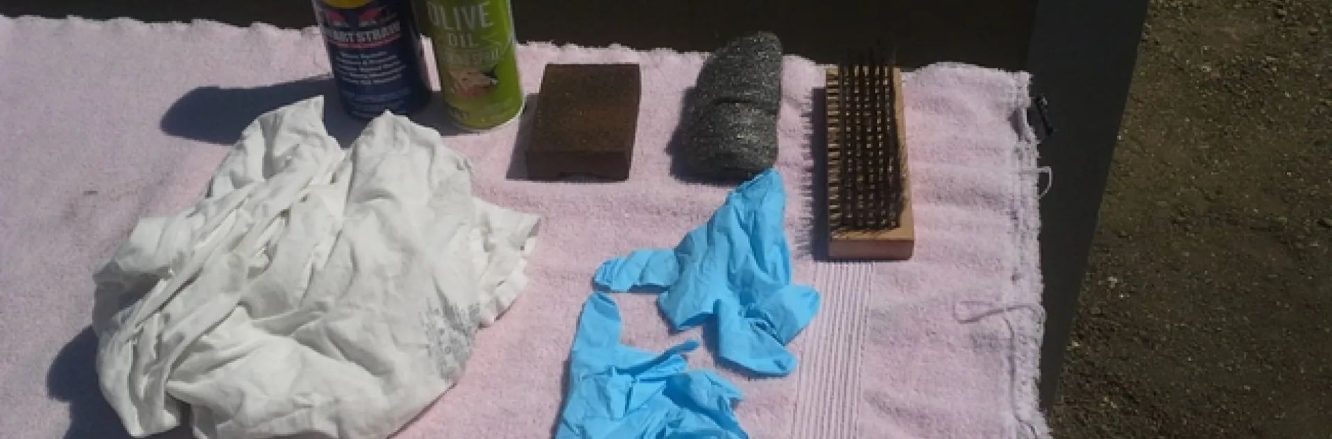 Setting the mood, I put in my earbuds and listen to a music selection while I set up my work station for maximum results. The workbench is lined with newspaper and my cleaning and sharpening implements are all laid out for easy access. I lay out some latex gloves, coarse sandpaper, or sanding block/sponge, some steel wool, a wire brush (plus a rotary wire brush for stubborn rust spots), a pumice stone, and a putty knife to scrape off any remaining dried soil. For lubrication, I have a spray can of WD-40, and one of vegetable oil.