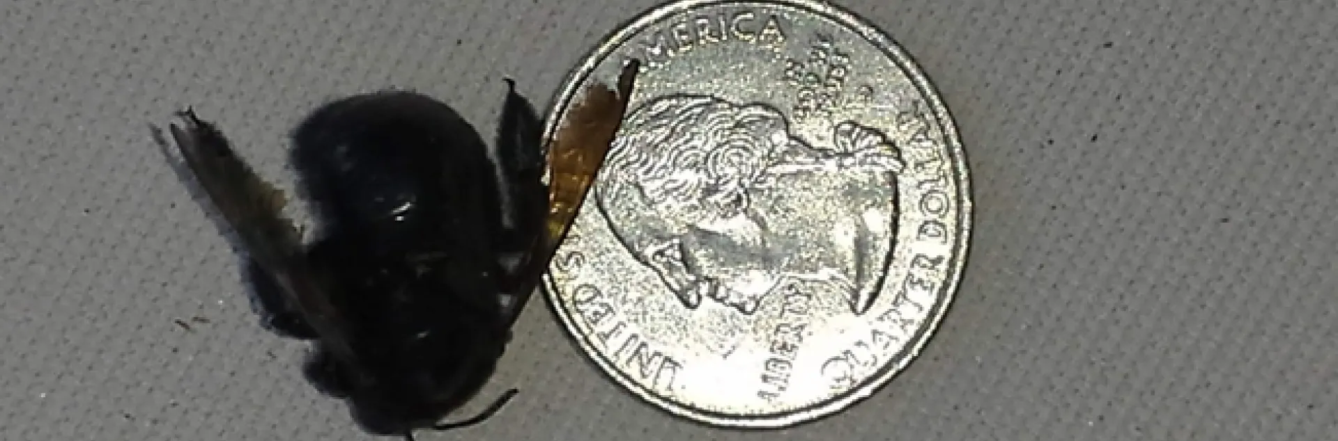 Carpenter bee next to a quarterThere are three species of Carpenter bees here in California: Xylocopa varipuncta , X. californica & X. tabaniformis orpifex. I'm not sure which one that we have. All three species are the largest bees in California at around an inch long. The Carpenter Bee eggs are the largest of all insect eggs at about ½ inch long. The females are black and shiny and the males are large and colored gold or yellow. The females are the ‘carpenters' using their mandibles to drill deep holes eight to ten inches in depth in untreated wood. They will sting but only when provoked. The males don't sting, are territorial and spend their time lying in wait for passing females.