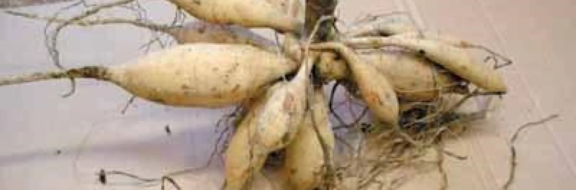 Or as shown in Photo 4 you can clean and trim each tuber with an “Eye”(the “Eye” being where the new stem will grow.) then label the tubers with a ink marker or plastic label then roll them up in plastic wrap with some shavings and store them wrapped. The advantage is they take up less space and you can see how they are doing as well as being able to see the name of the tuber. You will also be able to see how the “Eye” is developing.