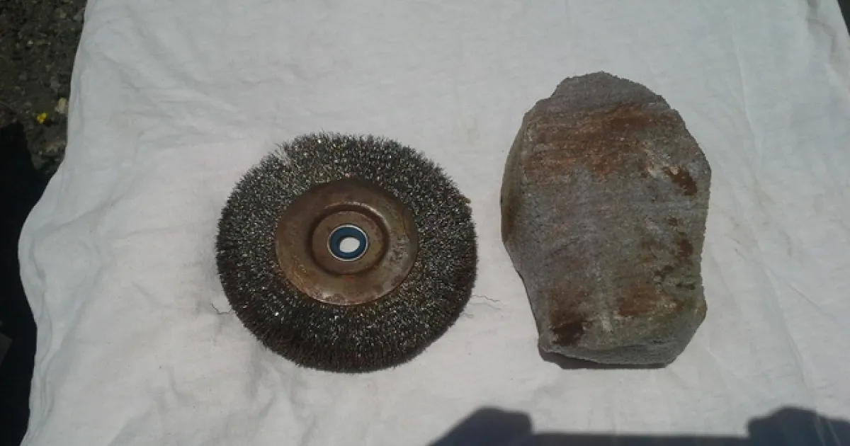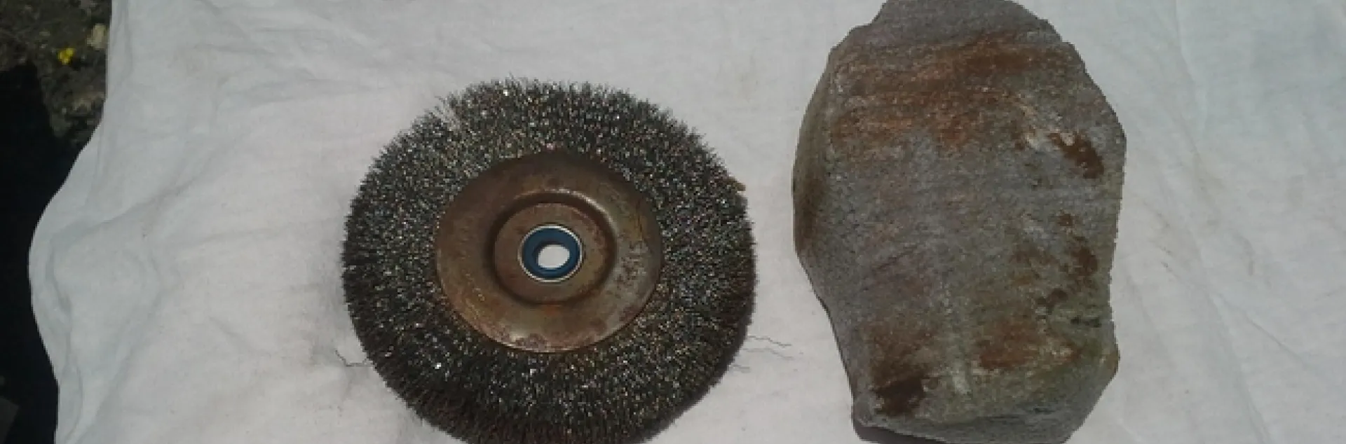 Every tool is cleaned and dried sap, soil and any rust is removed from the metal surfaces using the sandpaper, wire brush and steel wool.  Stubborn spots are hit with the pumice stone and rotary wire brush.
