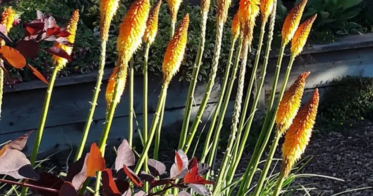 The variety of Kniphofia commonly seen in my neighborhood is uvaria. The leaves of these clumping plants are long, thin and grass-like, and the clumps grow to be 2-3 feet wide and tall. The long lasting flowers do look like red hot pokers or upright torches on long stems that can sometimes reach 5 feet tall. Each of these multiple stems terminate in a 4+ inch multi petaled cone shaped flower that graduates from a base of light yellow to the top of deep crimson. For the best performance, plant these rhizomatous perennials in full sun. The plants will still perform in partial shade, but flower production will be greatly reduced. Bees and hummingbirds flock to these brightly colored blooms throughout the blooming season. Kniphofia prefers well drained, moist but not wet soil. If you deadhead spent blooms on plants the blooming season will be extended. In the fall, cut off the dead foliage around the base of the plants and clumps can be dug up and divided, if desired. If left as is, they will continue to expand outward without decline in floral display or decline the plant's leaves and summer blooms. So, if you don't plan on moving the plants any time soon make sure to locate them where they have room to grow.