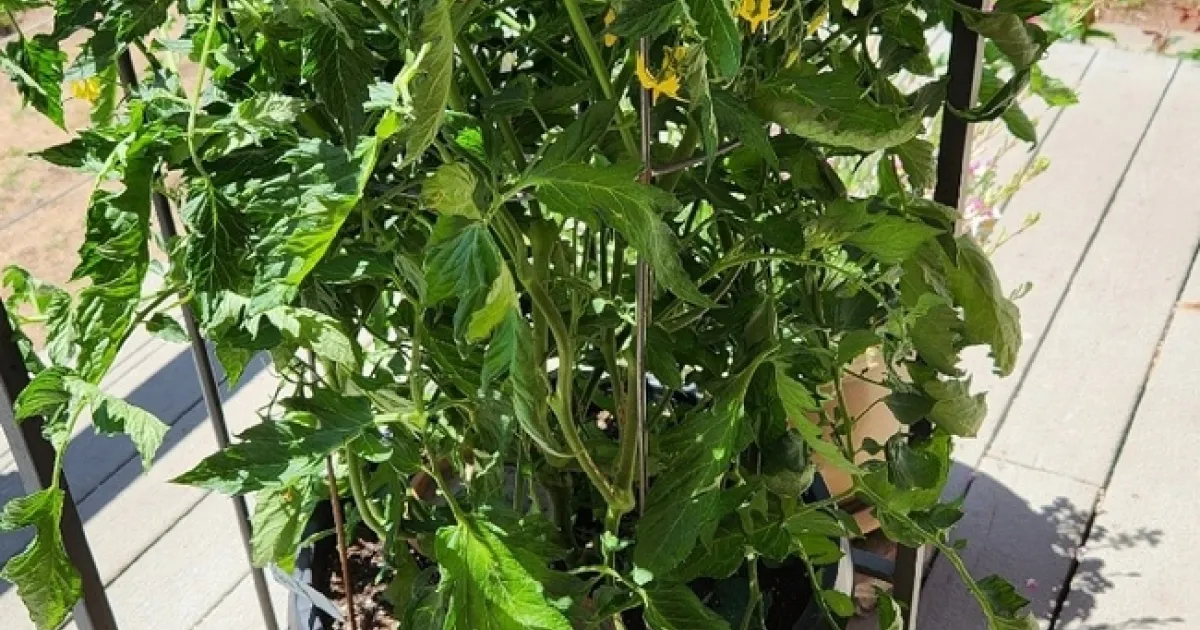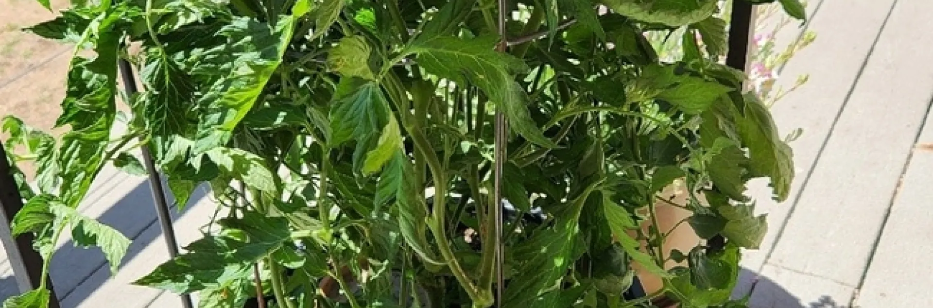 If your plants are getting tall, it's time to stake them. You can put a tomato cage over the plant with the feet buried inside the pot. If you place the plant against a wall or pole, you can tie the stake to that to add stability. Any structure that will stay firmly in place and can contain the growing stems will work. The corner of a gazebo is a great place for a plant. It's best to get the stakes in place early so you can gently tuck the new growth inside the horizontal constraints and keep them growing upward. Otherwise, they will grow sideways and be vulnerable to breakage. Prairie Fire is the one test plant that is semi-determinate, meaning a vining type that will continue to grow taller, so it is most in need of support. The other two are supposed to grow to about 3 feet, but they may need support as well. Better to be safe and provide support than to have the stems fall over and break off.
