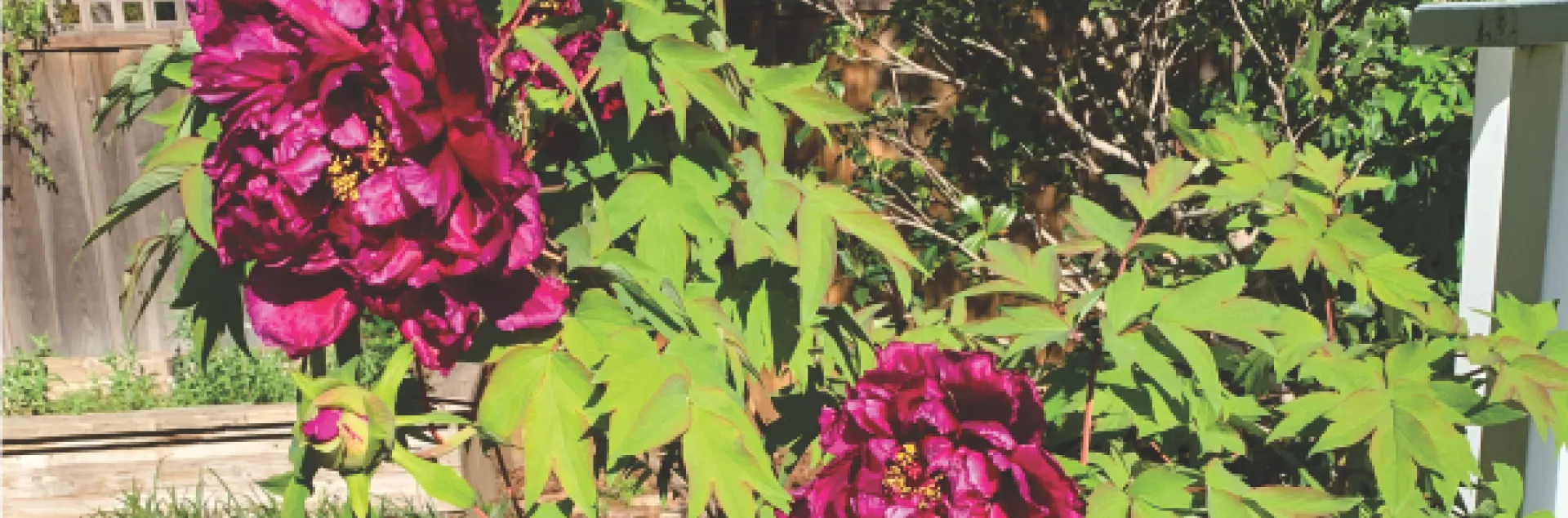 Tree peonies are deciduous. They lose their foliage in the fall, but their woody stems do not die back to the ground like herbaceous peonies. They do best when they have a cold winter for dormancy and hot summers. Usually labeled as a sun plant, tree peonies prefer some dappled to light shade in the afternoon in Napa County with our hot summer afternoons. Their woody structure supports gigantic saucer plate sized flowers on a plant that can grow up to 7 feet high. One of my trees has finished blooming and is full of beautiful shapely leaves. The deep green foliage turns bronze and purple in the fall. So, these trees keep “giving” from early spring on into fall.
