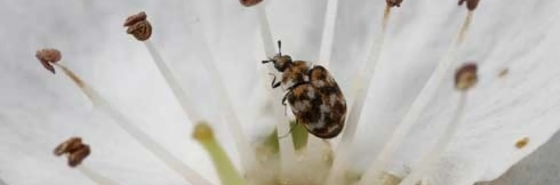 Carpet beetles adults feed on pollen and nectar of flowers. They often fly into homes from flowers in the landscape or may be accidentally brought indoors on cut flowers. A few adult beetles inside your home are typically not a problem. However, if you find larvae, the fuzzy immature beetles on fabric, carpet, or other natural materials in your home, you may need to manage the infestation.