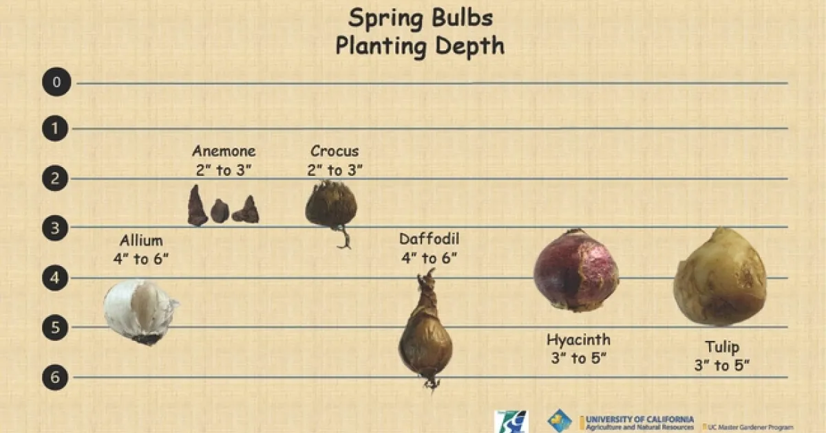 Note the planting depth for the bulb species. To be safe, bulbs should be planted 5-8 inches deep measuring from their base. Add 10-10-5 fertilizer and cover with 2 inches of soil. Turn the pointed end of the bulb up and roots and plate down. Plant in its hole. It is fine to plant some bulbs close together like tulips. If you want them to multiply, leave space at least two or three times the bulbs' width. Some need more room like allium bulbs at 13 inches apart. When planting several large bulbs close together, dig one large hole. Backfill over each bulb with amended soil to the proper planting depth. For large areas, it is best to amend the soil when it is prepared for planting.