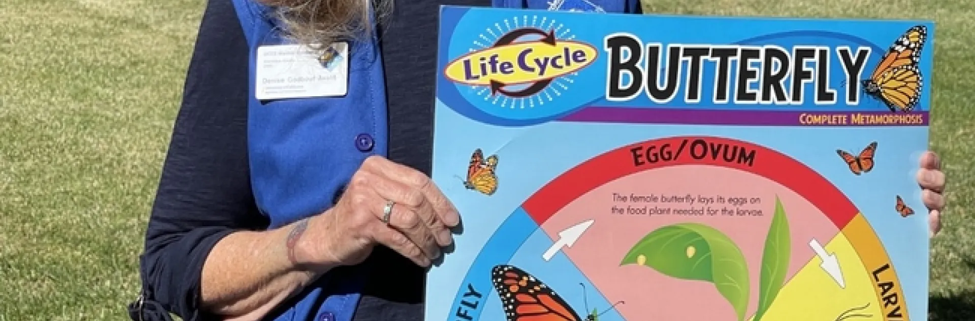 Master Gardener Denise holds up a diagram of the monarch butterfly lifecycle.