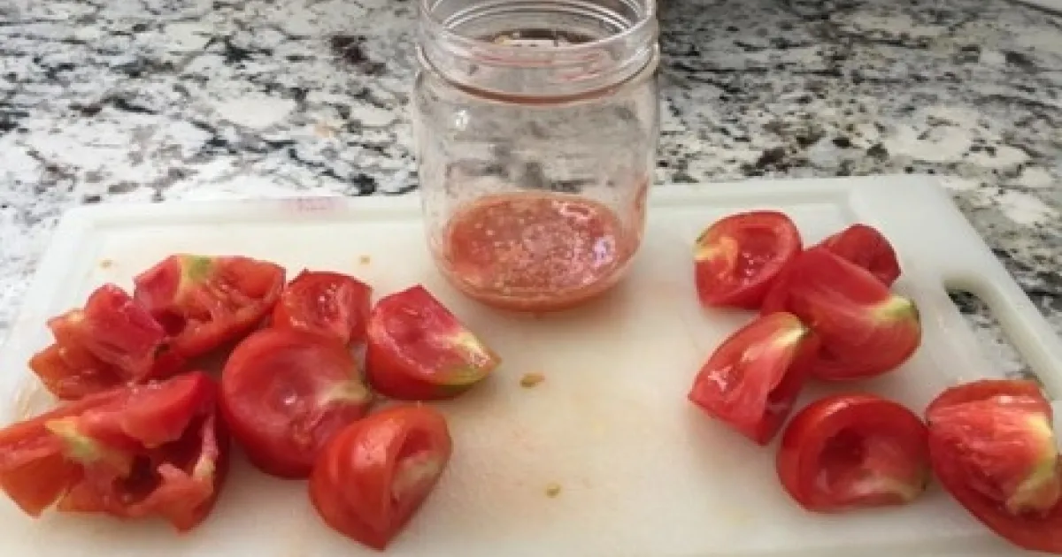 Step 2: Cut tomato, scoop out seeds & put into jar.