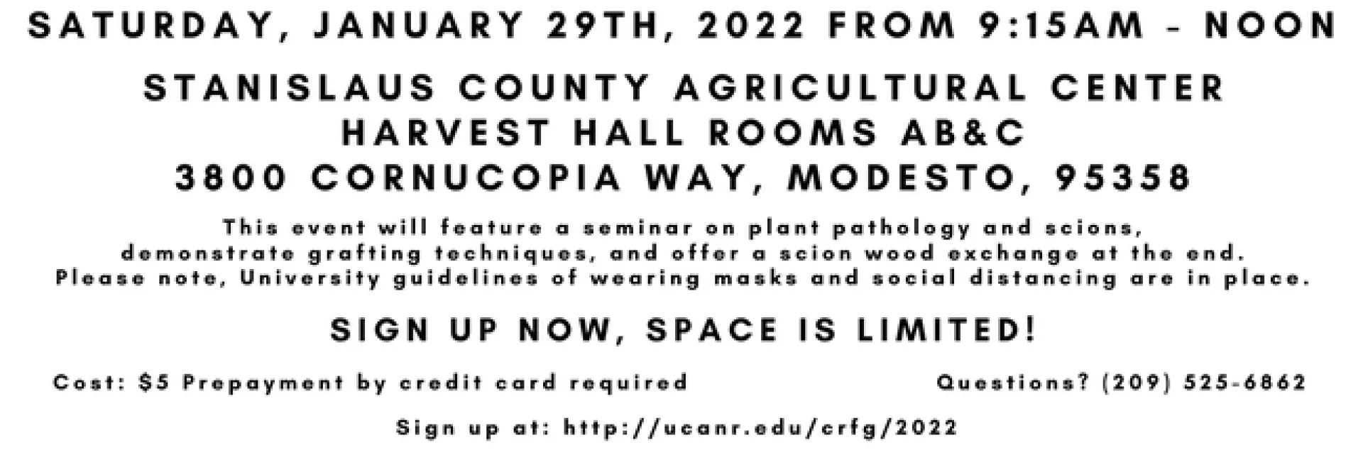 Additionally, an in-person opportunity is being offered for Saturday, January 29, 2022 from 9:15 a.m. to noon at the Agricultural Center, Harvest Hall, in Modesto. Here is the class flyer. Space is limited, please sign up now at http://ucanr.edu/crfg/2022