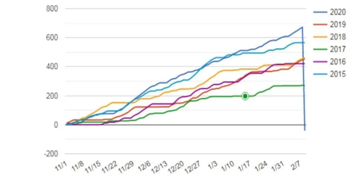 I include a copy of the chart comparing all of these chill accumulations below, note that years are labeled by the year the accumulation starts, ie 2019 marks Nov 1, 2019 through Feb 8,2020.