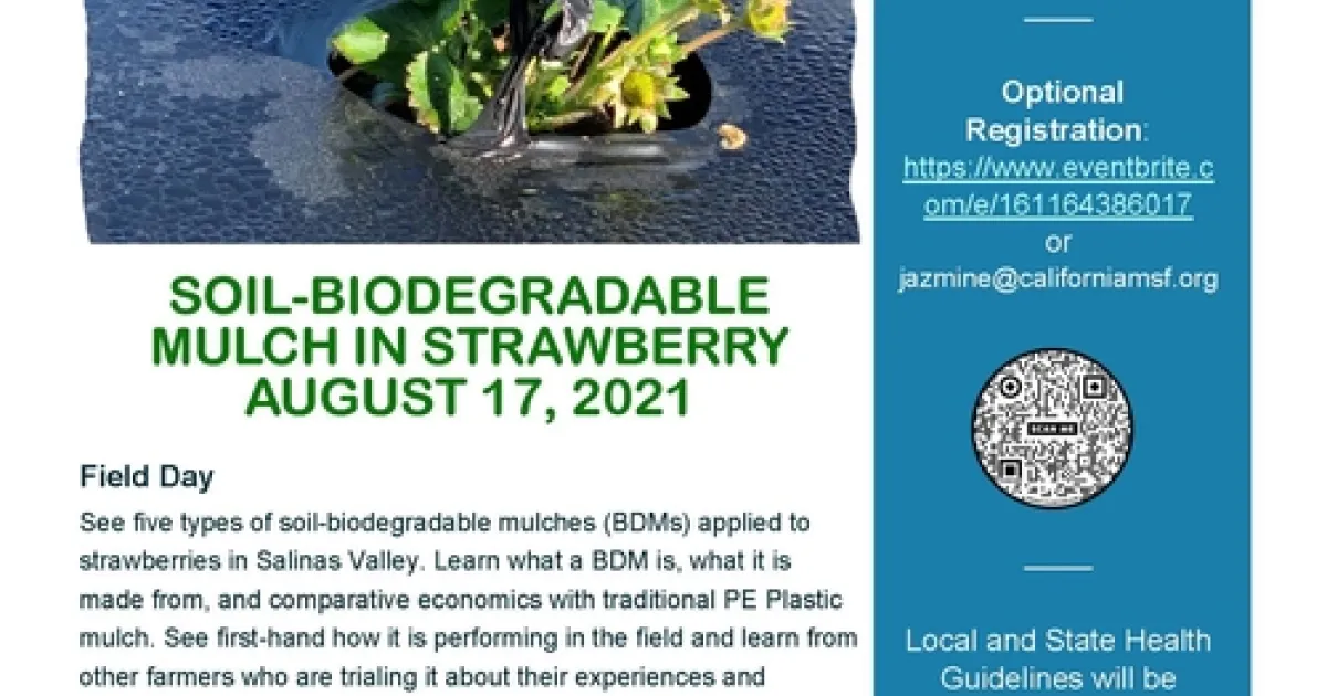 As many of you are no doubt familiar, UC Cooperative Extension, Washington State University and Monterey Bay Marine Sanctuary have been working together this past year field testing five different formulations of biodegradable bed mulch in strawberry. This August 17 you all have the opportunity to come out see how these have performed over the past 8 months on a strawberry ranch south of Castroville, and speak with the growers and scientists who have been involved with this.