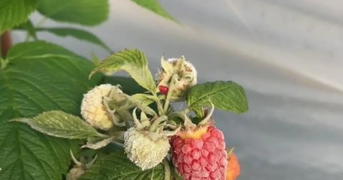 Here's a photo submitted by reader Ted Swartzbaugh down in Ventura county of something you don't see too often. Powdery mildew in raspberry which has advanced to the fruit, and if you look close you can even see evidence of the disease on the petiole.