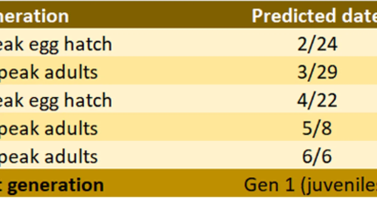 Thrips are likely 1st-generation juveniles (1st-gen egg hatch peaked 2/23, and adults are predicted to peak 3/29). Currently 2nd-generation egg hatch and adults are predicted to peak at 4/22 and 5/8, and 3rd generation adults predicted to peak in early June. Thrips control is most effective in the 2nd and 3rd generations.