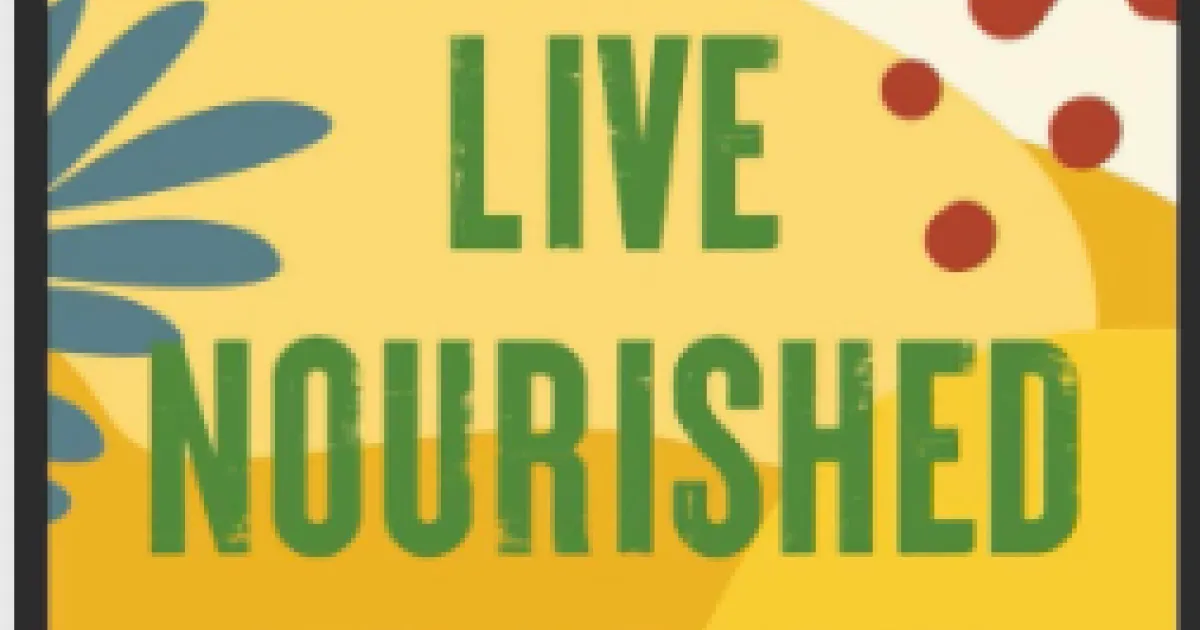 yellow background with flowers and plant animations with the words Live Nourished in green