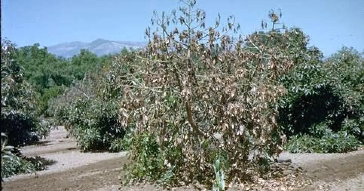 The fungal pathogen Verticillium dahliae infects many hosts, including various berry and flower crops, cotton, eggplant, olive, pepper, stone fruit trees, strawberry, and tomato. Verticillium wilt is present throughout the state but is less common in avocado than root rot and canker diseases. Verticillium dahliae persists for years as microsclerotia in soil. Microsclerotia spread in infested organic matter and soil that is moved. The fungus infects through feeder roots, and then moves up in the water-conducting xylem system, restricting or preventing water movement to foliage from the roots.