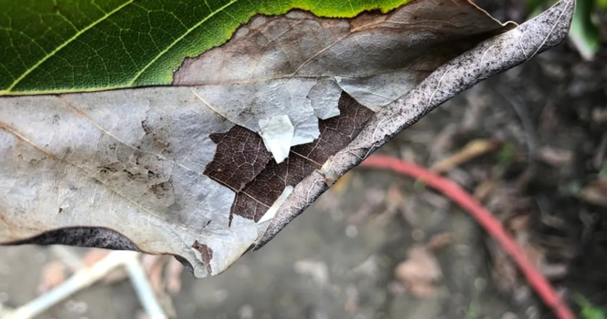 An avocado leaf with its cuticle (white, paperlike surface) being exposed by underlying leaf fungi.