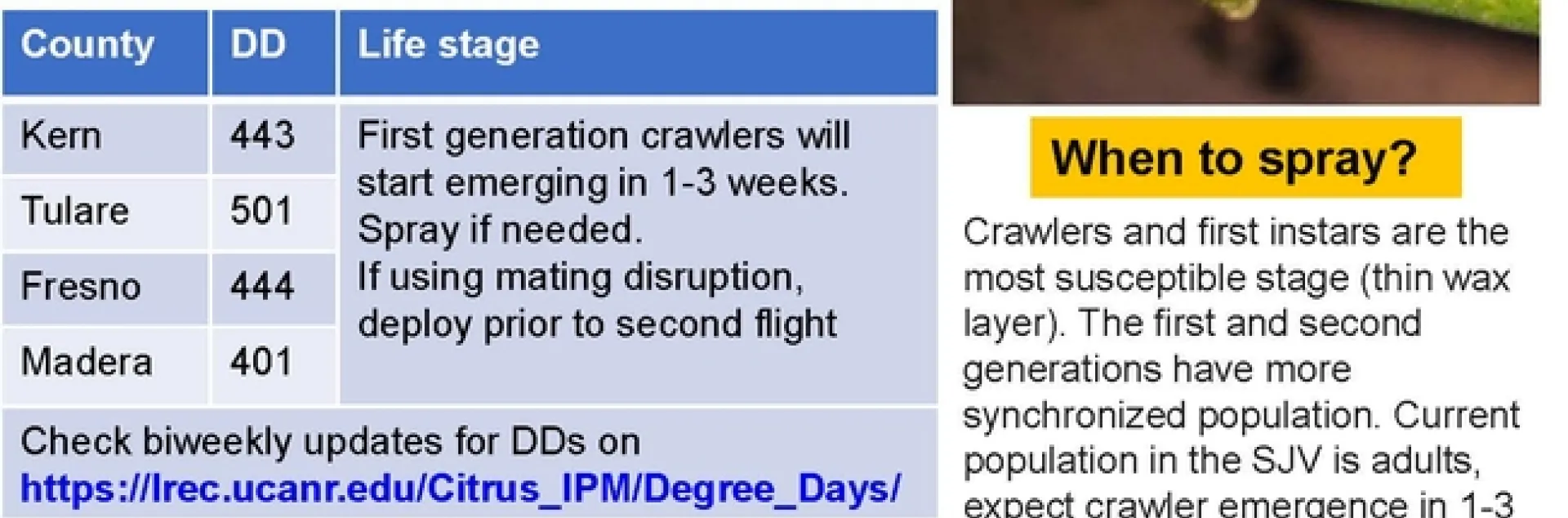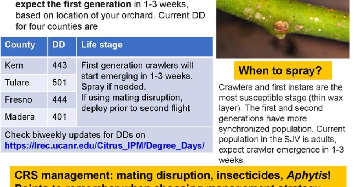 Please find first California red scale memo for 2024 season. CRS degree days for four counties, Kern, Tulare, Fresno, and Madera are updated on the LREC website. Please visit link for biweekly DD updates using the CIMIS station data https://lrec.ucanr.edu/Citrus_IPM/Degree_Days/.