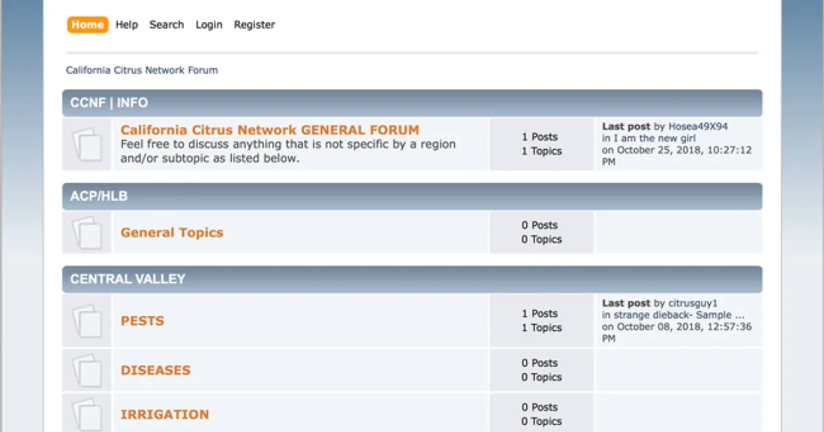 The ideology within this forum is to allow people within the field to exchange information in real time. It has been my personal observation, for example, that many PCA's have their own small network of individuals that they rely on for information regarding specific issues or problems encountered in the field and often only talk amongst themselves. It is my belief that having an internet-based forum would allow individuals to broaden this ‘in house group' to all individuals involved in the industry to better communicate ideas, information, and concerns regarding various aspects of citrus production. The forum site is set up to deal with the various citrus regions; SJV, Desert, Coastal, Southern Interior, and Sacramento Valley. The specific areas set up thus far are; Pests, Diseases, Irrigation, Fertility, Weeds, Harvesting Issues, and Post-Harvest Issues. Two additional sections have also been set up for discussions: a general citrus area, and a posting area dealing with all issues related to ACP/HLB. Users will also be able to upload pictures taken from the field when posting a question.