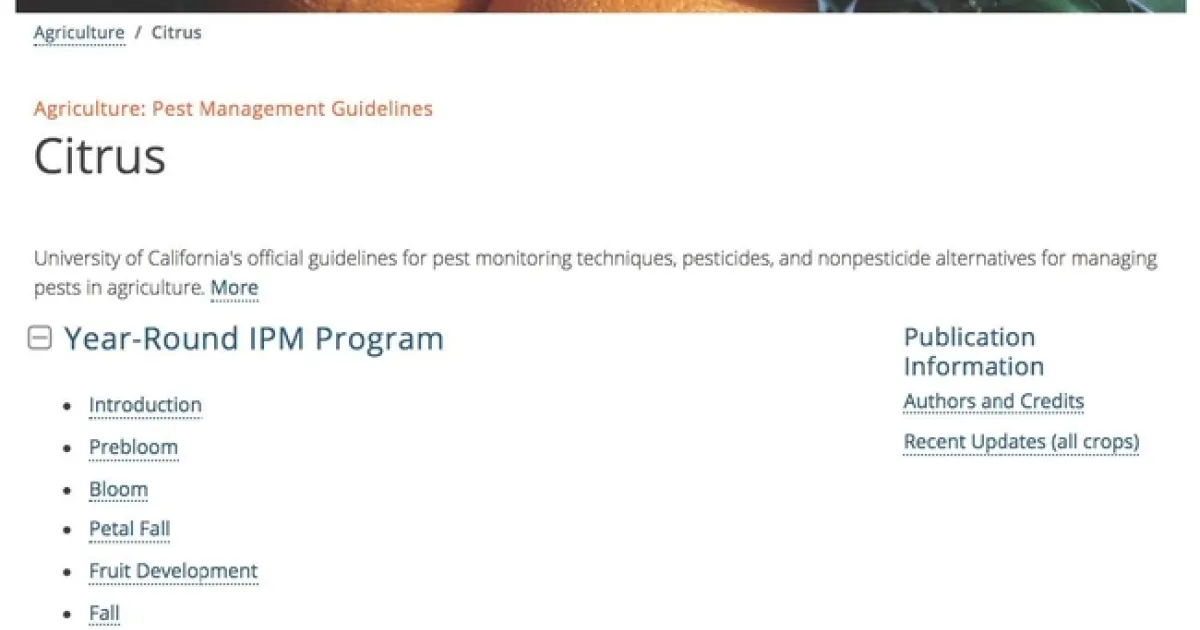 UC IPM revised the weeds, nematodes, plant growth regulators, and diseases sections of the Citrus Pest Management Guidelines! Learn how to manage diseases like anthracnose, bacterial blast, bot gummosis, brown rot, dry root rot, phytophthora gummosis and many more! Check out the new huanglongbing and hyphoderma gummosis sections. Learn also how to increase fruit set & size and reduce fruit drop using the updated section on plant growth regulators. Citrus Pest Management Guidelines (PMG)