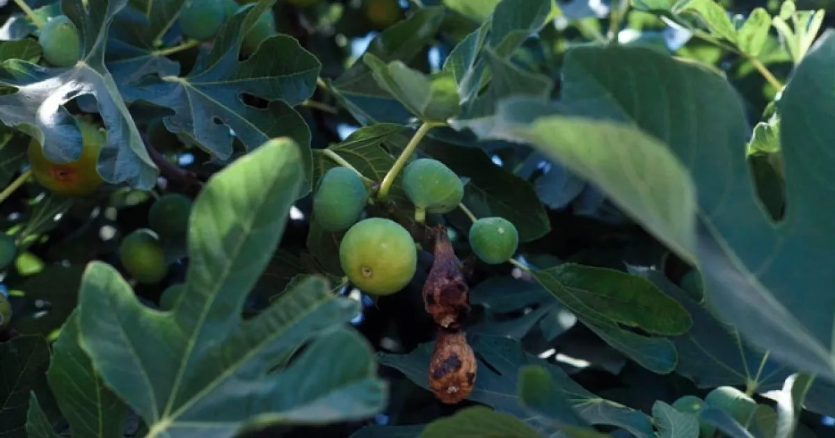 The Calimyrna fig is a green-yellow to yellow skinned fig with amber pulp. As noted above, the cultivar requires caprification to set a crop. The first (Breba) crop drops without coming to maturity because caprifigs containing pollen and the vector wasp are not available at the time the Calimyrna Brebas require pollination. The second crop is abundant but of limited duration (from late August to late September in Fresno County). Fruit set coincides with the mid-summer (or profichi) flight of the fig wasp. When the flight is complete, no more fruit is set for that season. Early in maturity of the second crop, fruit size is large, although size can drop off in late September. The size of the Calimyrna fruit eye (or ostiole) is the largest of all the commercial cultivars and can range from 2.2 to 3.5 mm, allowing substantial amounts of internal insect infestation and spoilage. The cultivar is also prone to large numbers of eye splits during periods of high humidity, cool weather or rain. Fruit quality, when the fruit is grown well, sets the standard for excellence.